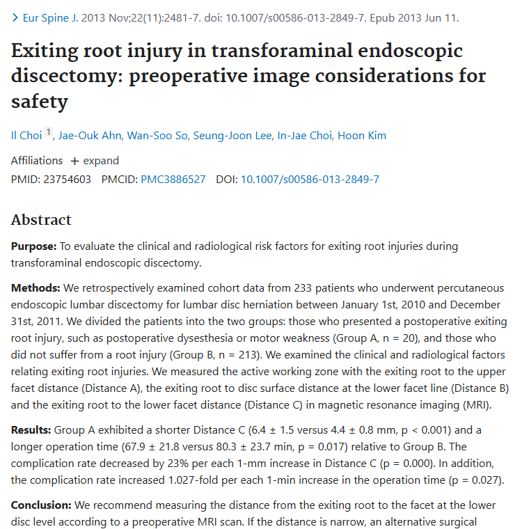 Exiting root injury in transforaminal endoscopic discectomy: preoperative image considerations for safety 최인재 2025.09.26 첨부 파일 다운로드