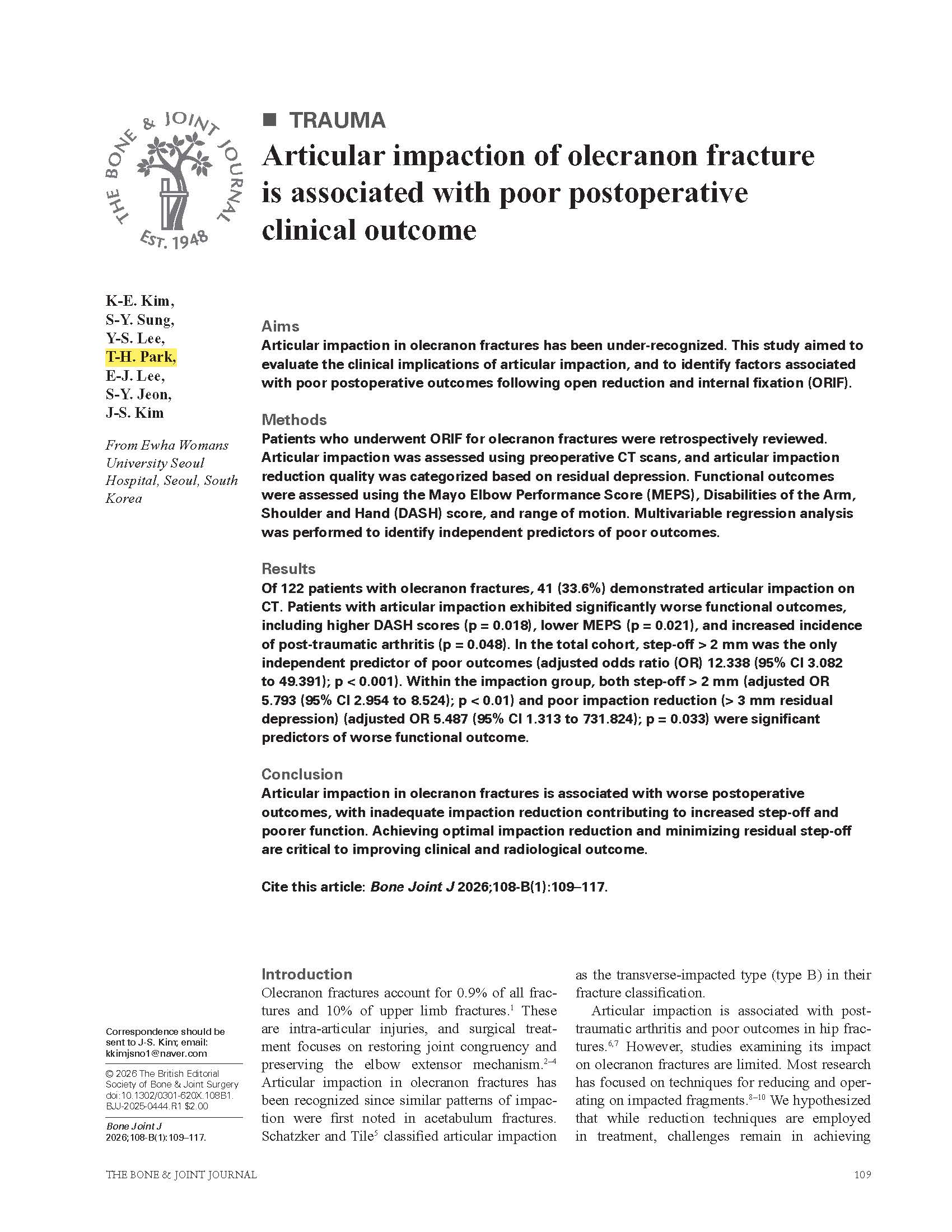 Articular impaction of olecranon fracture is associated with poor postoperative clinical outcome 박태훈 2026.01.12
