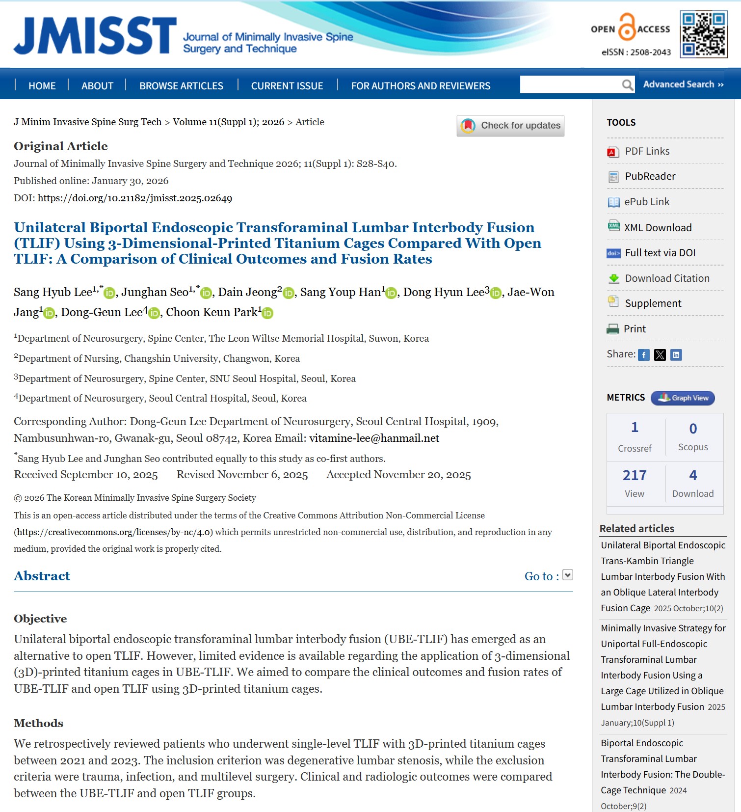 Unilateral Biportal Endoscopic Transforaminal Lumbar Interbody Fusion (TLIF) Using 3-Dimensional-Printed Titanium Cages Compared With Open TLIF: A Comparison of Clinical Outcomes and Fusion Rates 이동근 2026.02.09 링크